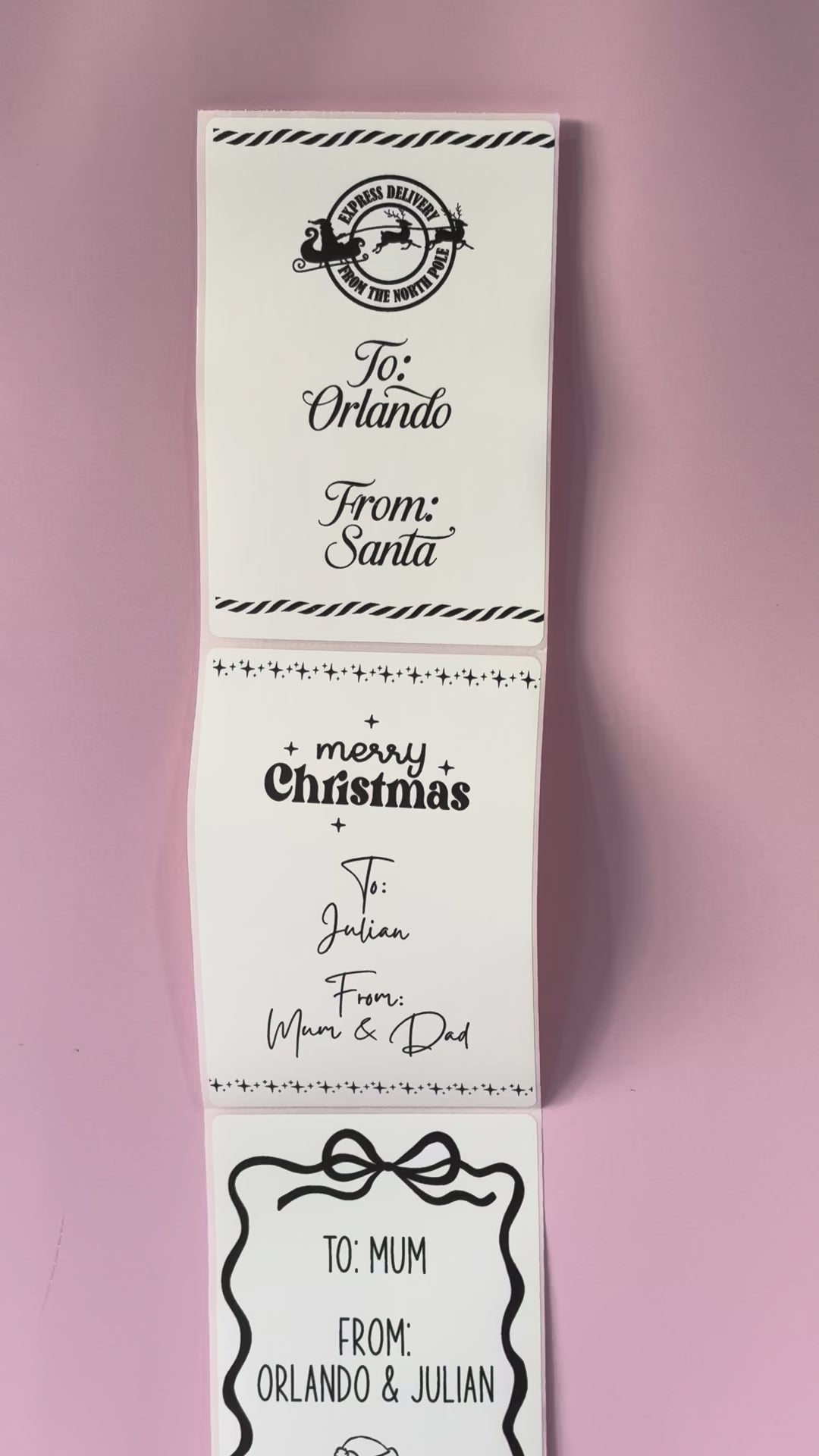 They're perfect for those clever kids who ask why Santa's writing on their present label looks just like yours, or just to add some fun to anyone's present. They're easy to apply (just peel them off the backing) and available in white, red, or pink labels, all with black text. You can choose from our set designs which we'll customise with the name/s you need, or create your own design from our range of fonts, images and other elements.